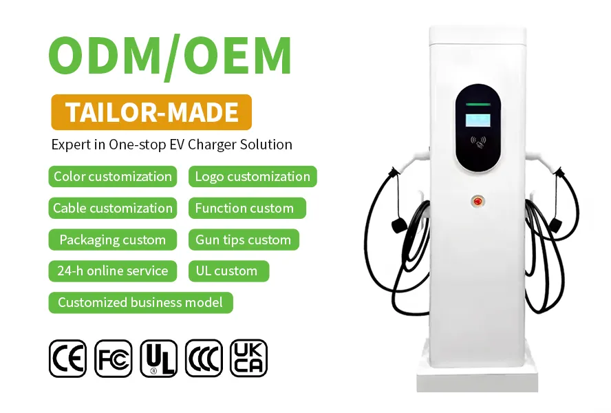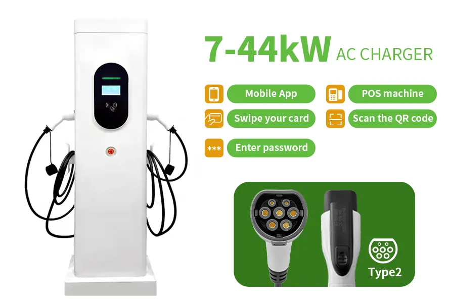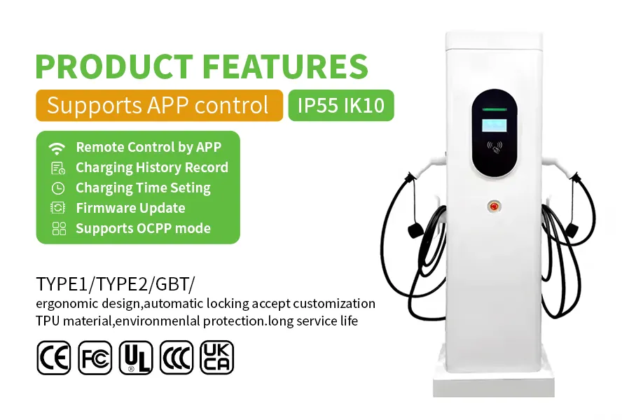 This commercial use 14kW 22kW 44kW EV floor-mounted charging station features a 4.3-inch high-brightness display, IP54 protection, and forced air cooling with dustproof design. It ensures safety with an electronic lock function and supports TYPE 2 interface standards. With a durable MTBF of 30,000 hours and comprehensive pre-shipment testing, it delivers reliable performance for altitudes up to 2000m.